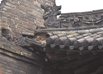 全国重点文物保护单位山西省汾城古建筑群的城隍庙一处建筑檐部瓦件脱落(10月12日摄)。