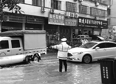 近日,苍南县出现强降雨和大风天气,各大道路出现满水情况,严重影响道路交通。苍南交警灵溪中队加强现场交通执勤力量,强化交通组织和管控疏导,全力排堵保畅。