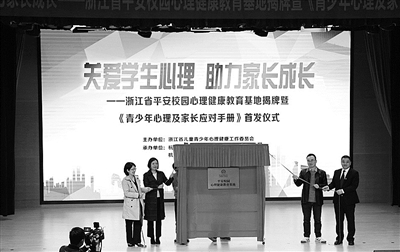 本报讯 10月22日下午,浙江省平安校园心理健康教育基地揭牌暨《青少年心理及家长应对手册》首发仪式,在杭州大关实验中学举行。现场来了不少专家学者,向112位家长代表发放这份手册。