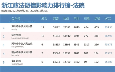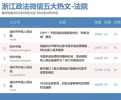 法院榜上,“温州市中级人民法院”“杭州中院”“湖州市中级人民法院”名列前三。热文榜上,《136个!平阳法院全面推进村社“共享法庭”建设》一文,介绍了法院推进村社“共享法庭”建设的情况,颇受读者关注。
