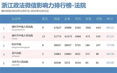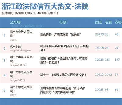 法院榜上, “湖州市中级人民法院”“温州市中级人民法院”“杭州中院”名列前三。热文榜上,《刚柔并济、淬炼成钢的“领头雁”》一文,介绍了平阳县法院法官金海雁的先进事迹,颇为吸睛。