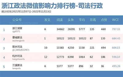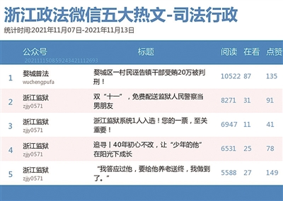 本期司法行政榜,“浙江监狱”依旧稳坐第一。“婺城普法”一鸣惊人,不仅获得榜单第二,其《婺城区一村民诬告镇干部受贿20万被判刑!》一文还获得了最高阅读量,拿下热文榜第一。