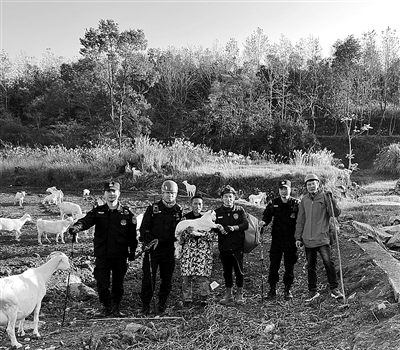 近日,临海市杜桥镇知建村村民老王报警称,他家散养的59头山羊失踪了。杜桥派出所出动3名特警、2名义警上山搜寻。5个人在深山密林中徒步搜寻7小时,终于找到了走失的羊群。图为找到羊群后,众人与羊来了一张“合影”。