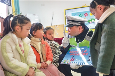 近日,三门县公安局珠岙派出所、珠岙交警中队,组织民警到幼儿园开展交通安全知识和防拐宣传。图为民警在教幼儿园小朋友识别交通标记。通讯员 林利军