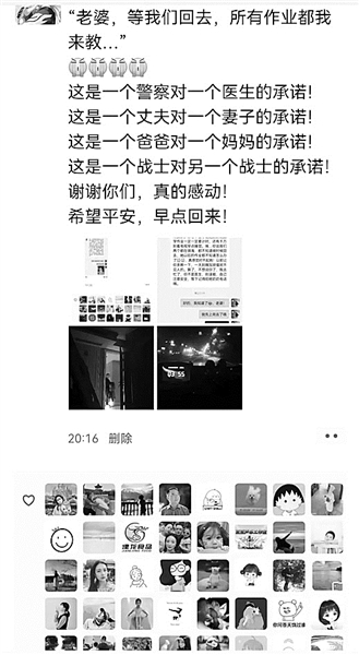 连续工作15小时后,陈晶晶给吴彬丙发去微信:“别逞能,自己注意安全,等下记得给她奶奶电话。”吴彬丙1个多小时后才看到这条微信,心里好生愧疚,他在朋友圈里写道,“老婆,等我们回去,孩子的所有作业都我来教。”这段圈文和背后的故事,很快火遍全网,连人民日报官方微信都转了。