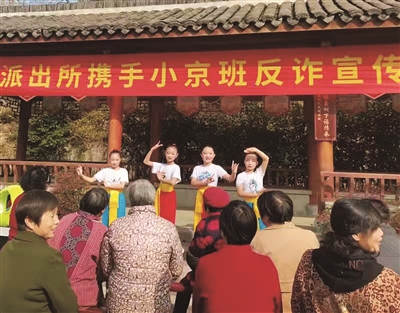 日前,长兴县小浦小学“小京班”的孩子们在八都岕景区银杏树下,演唱自编自创的《防骗热线记心间》《擦亮眼睛防诈骗》等京剧唱段,向群众宣传防诈知识。通讯员 张秋平 摄