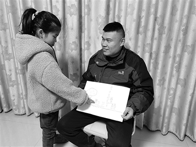 “爸爸加油喔,我们爱你!”新年第一天的晚上,10岁的女儿鲍徐言在鲍伟杰耳边悄悄地说。她还画了一张“虎虎生威”贺卡送给鲍伟杰,妻子徐婷为他们拍照记录下了这个温馨的瞬间。