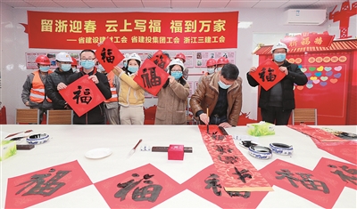 1月6日,由浙江省建设建材工会、浙江省建设投资集团股份有限公司工会联合主办的“留浙迎春、云上送福”活动,在杭州德寿宫遗址保护展示工程暨南宋博物院(一期)项目部举行。今年的送福活动通过“线上+线下”互动参与形式,把福字、春联等送到工地,向奋斗在一线的建设者致敬。