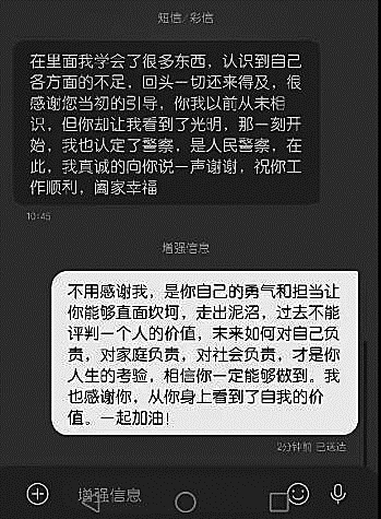 本报讯 近日,台州市公安局椒江区分局下陈派出所副所长陈路的手机上收到一条特别的短信。短信是这样写的:“在里面我学会了很多东西,认识到自己各方面的不足,回头一切还来得及,很感谢您当初的引导,你我以前从未相识,但你却让我看到了光明,那一刻开始,我也认定了警察是人民警察。在此,我真诚地向您说一声谢谢,祝您工作顺利、阖家幸福。”