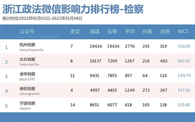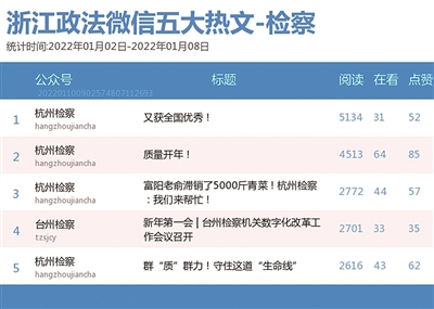 本期检察院榜,老将“杭州检察”表现亮眼,拿下两榜第一。该公众号的四篇文章入围热文榜前五名,其中《又获全国优秀!》一文,荣登榜首。