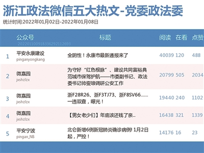 本期政法委榜,前三分别是“微嘉园”“平安宁波”“平安永康建设”。热文榜上,“平安永康建设”的《全阴性!永康市最新通报来了》夺魁。当前疫情防控形势依然严峻复杂,大家一定要自觉服从疫情防控要求,加强个人防护。