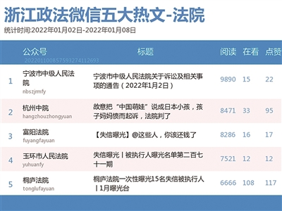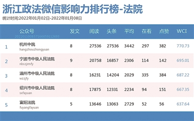 本期法院榜,依旧是大家熟悉的“杭州中院”夺冠,“宁波市中级人民法院”劲头十足,紧随其后。热文榜上,“宁波市中级人民法院”的《宁波市中级人民法院关于诉讼及相关事项的通告(2022年1月2日)》一文拔得头筹。