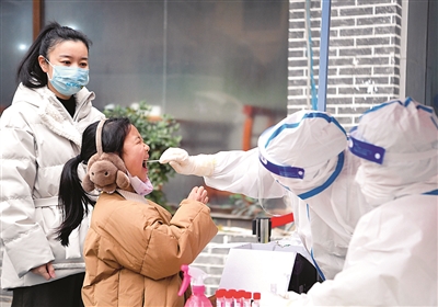 1月10日,在郑州市纬一路核酸检测点,医务人员为小朋友进行核酸检测取样。