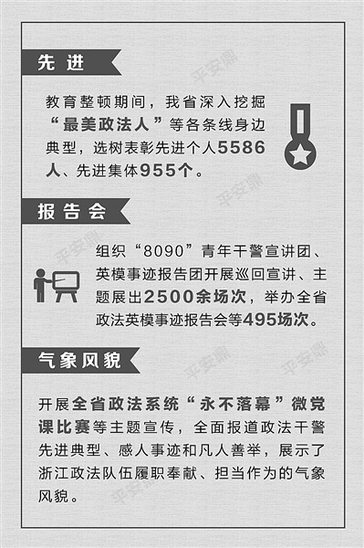 根据党中央统一部署,从2021年2月到12月,浙江分两批扎实开展政法队伍教育整顿,12.5万名政法干警接受了一次革命性锻造,政法战线经受了一次全覆盖“体检”,政法工作水平得到了全方位提升。