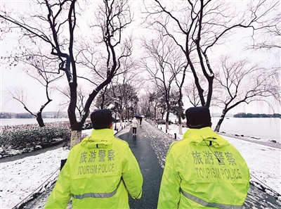 2月7日上午,杭州迎来下雪天,西湖断桥景区的游人络绎不绝。“注意安全!小心路滑!”值守在断桥的杭州市公安局景区分局岳庙派出所民警何晓鸣早早走上桥头,不厌其烦地对往来游客做着安全提醒。