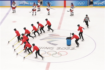 在国家体育馆冰球赛场上,冬奥会冰球比赛激战正酣,除激烈拼抢的各国运动员外,每一场比赛都能见到一群身着红衣的少年在赛场上穿插忙碌,为比赛的顺利进行提供保障,他们就是国家体育馆清雪保障“雪童”团队。