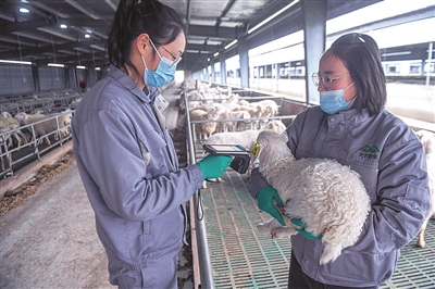 | 2022年1月6日,长兴县吕山乡湖羊智慧循环产业园的工作人员在扫描湖羊幼仔耳朵上的数字芯片。 新华社 徐昱 摄 |