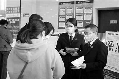 近日,海宁市法院干警来到市人社局举办的女性就业专场招聘会,开展妇女维权宣传。法院干警就地设置普法宣传台,向过往群众发放手册,解答妇女就业维权、婚姻家庭、继承等法律问题,引导广大妇女用法律武器维护权益。
