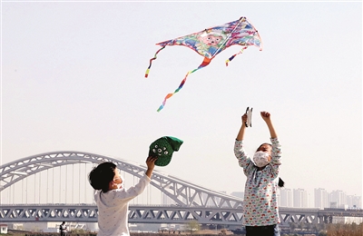 3月9日,小朋友在江苏省苏州市澹台湖公园放飞风筝。