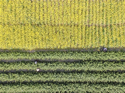 连日来,随着天气回暖,田间地头随处可见农民忙碌的身影。图为淳安县姜家镇郁川村的茶农在茶园采摘春茶(无人机拍摄)。