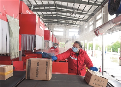 与此同时,快递车辆进场后要进行整车消杀(包含车厢内及车厢外围)。随后包裹进入作业场地,每条流水线前均开启消杀喷头,所有包裹都要在倒件口进行一次全方位消杀,每一面都不错过,之后才能安全地送到客户手中。“每天,我们还要对场地定点定时进行两次消杀。”叶文静说。