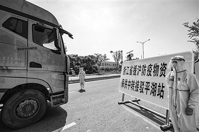 近日,平湖市公安局交警大队民警在浙江省援沪防疫物资保供中转接驳平湖站执勤,引导车辆进入中转站指定区域,全力保障站点全封闭管理和物资无接触运输转换衔接。