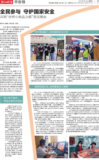 义乌市委国安办相关负责人表示,义乌将深入学习贯彻习近平总书记关于总体国家安全观重要论述,大力宣传新时代国家安全知识,增强全民国家安全意识,为“世界小商品之都”建设铸就更稳固的国家安全壁垒。