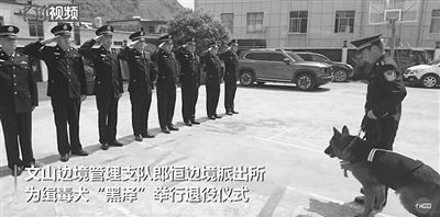 4月18日,在云南文山边境管理支队郎恒边境派出所,戍边近7年的缉毒犬黑泽退役。训导员撕去它的“警犬”标识,为它戴上大红花,全体战友敬礼送别。2015年9月至今,黑泽平均每天参加执勤或训练6小时以上,参与执勤2500余次。