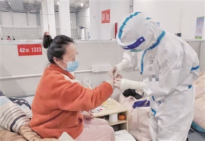 | 崔媛在上海临港方舱医院内为患者佩戴腕带 |