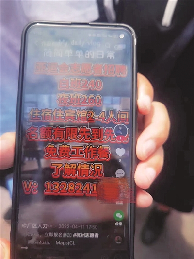 “亚运会志愿者招聘,名额有限,先到先得……”近日,抖音、快手、微信上,不少人转发了一条“杭州亚运会招聘志愿者信息”,里面提到月工资8000元左右,工作内容为维持现场秩序、测体温、检查行程码和核酸报告等,且包吃包住。