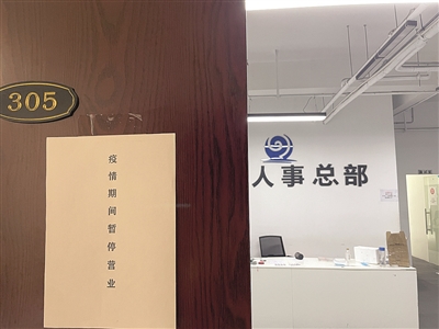 在305室的“英超”劳务公司人事总部大门上,张贴着“疫情期间暂停营业”的提示,但里面的灯还亮着,记者在该公司其他几间办公室转了一圈,均没有人。
