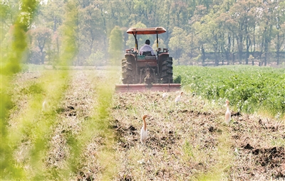4月20日,在上海嘉定区外冈镇的万亩粮田泉泾基地,农机手正驾驶农机对农田进行翻耕。