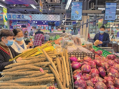 4月23日,杭州世纪联华运河店,粮油、蔬菜、水果、肉禽等日常生活必需品种类齐全,供应充足,市民选购秩序井然。拱墅区商务局表示,目前全区符合开放条件的29家超市均正常开门营业,全区“菜篮子”供应稳定,米、面、粮油、禽蛋等生活必需品供应充足,居民凭核酸检测阴性证明可进出超市。