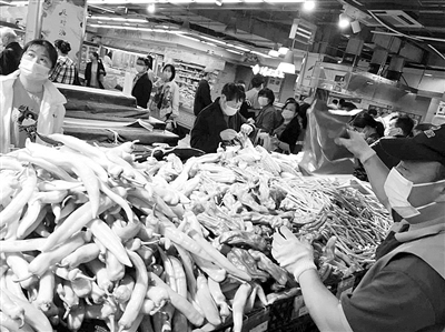 该店蔬果称重台的工作人员告诉记者,这两天他们凌晨4点就开始工作了,“来买蔬菜的人比平常多了不少,工作量增加了些”。肉类档口的工作人员说:“昨天有些居民抢着买肉,为了确保供应量,今天猪肉备货量增加了三倍,买肉的人却少了,大约少了70%。”