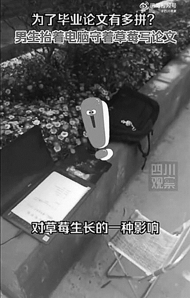 为了毕业论文可以有多拼? 男生带电脑守着草莓写论文