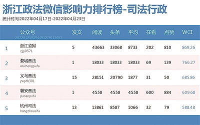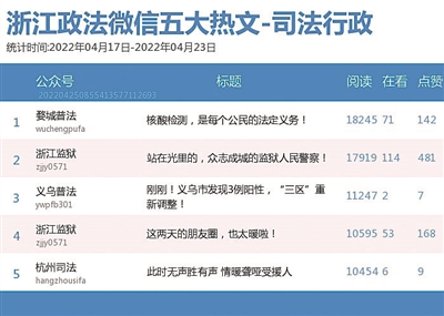 本期司法行政榜,“浙江监狱”依旧位列影响力榜第一名,而热文榜的第一名则来自“婺城普法”的《核酸检测,是每个公民的法定义务!》。文章通过漫画、视频等形式以案释法,介绍了违反疫情防控规定行为及法律后果。