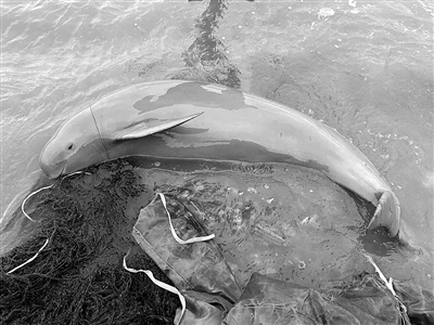 崔先生走近观察,发现这是只江豚,头部和尾鳍都被渔网缠绕着。崔先生赶紧将江豚身上缠绕的渔网解开,先后两次将它抱进海里,都被海浪打回了岸边。无奈,崔先生报警求助。