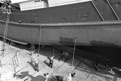 5月4日,玉环市灯塔船舶修造厂里,工人们正在给渔船做除绣、刷漆等维修保养“换装”工作。自5月1日进入伏季休渔期来,玉环市注册捕捞渔船全部进港休渔,做到“船进港”应休尽休。