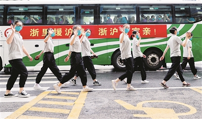 5月24日,浙江援沪医疗队的队员们列队走过停放在位于上海市浦东新区驻地外的大巴旁。
