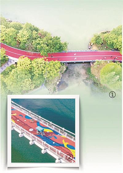 | 图①:江西省赣州市章贡区一处湿地公园内的健身步道 朱海鹏 摄 图②:浙江省杭州市淳安县千岛湖环湖骑行绿道 杨波 摄 |