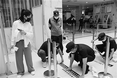 近日,玉环市消防救援大队组织消防救援人员来到辖区各核酸检测点,张贴“一米线”消防安全标语地贴,将疫情防控与消防安全、防灾减灾等结合起来。通讯员 王梦婷 摄