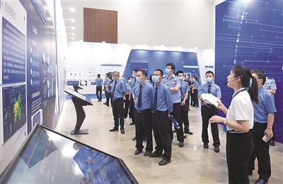 在省公安厅“数字公安”展馆,墙上的一枚大警徽十分夺目,下方是数字公安体系框架图,具有标识性,直观可感。
