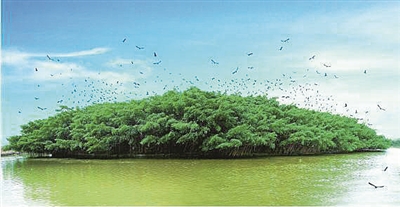 6月,正是鹭鸟繁殖的季节。在“小鸟天堂”,成千上万只鹭鸟在岛上树林栖息、觅食、繁衍,白鹭晨出暮归,夜鹭暮出晨归,风景线十分美丽壮观。