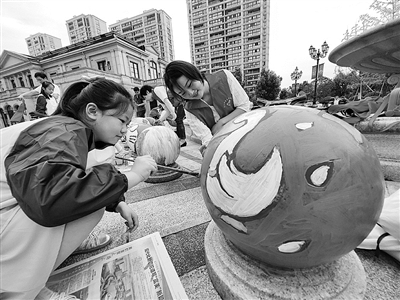 6月12日,余姚市兰江街道姚江社区新文明实践站联合美院少年机构在姚江社区广场开展亲子绘画活动。小朋友们以石墩为纸,以“文明城市”为主题,通过明亮的色彩,以童心展现美丽城市。吴大庆 摄