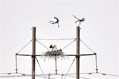 | 在黄河三角洲自然保护区,电线杆上直径数米的东方白鹳的巢。新华社记者 郭绪雷 摄 |