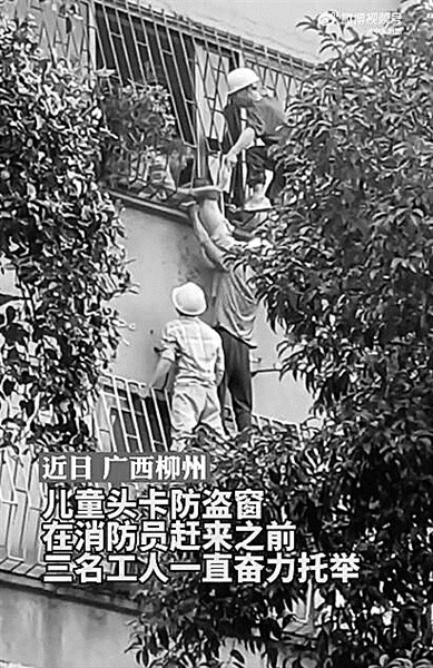 幼童头卡防盗窗 3名工人徒手爬四楼托举幼童