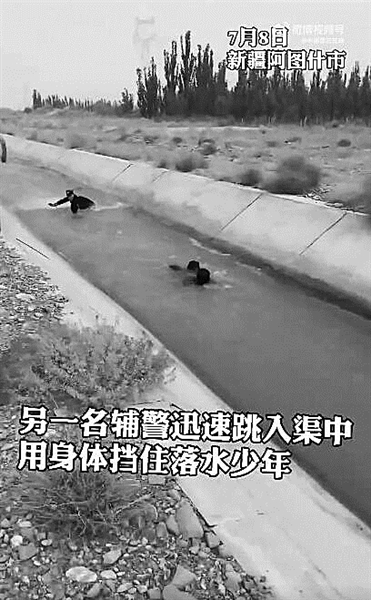 7月8日,新疆克州阿图什市,3名辅警巡逻途中发现一名11岁孩子被水冲走。危急时刻,一名辅警率先跳入渠中,但由于水流湍急,被石头击中,腿、腰部受伤。此时,另一名辅警也迅速跳入渠中,用身体挡住落水少年,并拉住在岸上的辅警递过来的木棍,并让孩子踩在他身体上爬上岸。第一个跳水救援的辅警为不给救援增加负担,主动放手。最终,被冲走辅警也被同事救起,两人均有不同程度受伤。落水少年因救援及时,无生命危险。