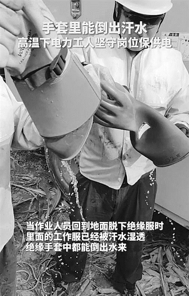 近日,为保障百姓夏季可靠用电,辽宁营口的电力工人们头顶烈日、冒着高温在15米高的线杆上对10千伏东线128号杆开展带电检修作业。当作业人员回到地面脱下绝缘服时,里面的工作服已经被汗水湿透,绝缘手套都能倒出水来。