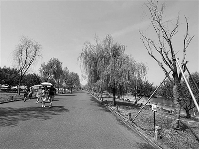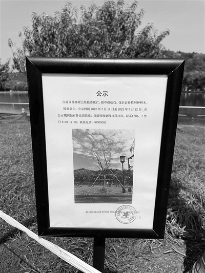 本报讯 7月13日,有细心的杭州市民和游客向本报反映说,他们发现西湖白堤靠近断桥一侧有柳树死亡,现场也已立牌公示,就之后如何处置向市民征求意见建议。