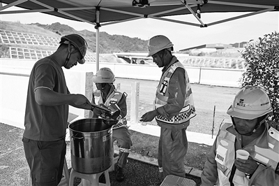 7月14日,在临建高速土建一标项目现场,工作人员为施工人员盛银耳汤消暑。